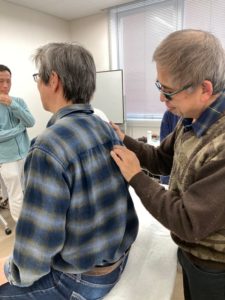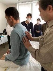 実技研修では、肩甲骨内縁における施術ポイントの見つけ方と、その具体的な施